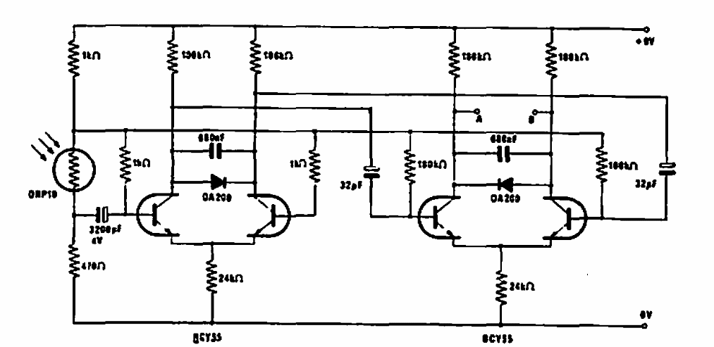 Encontrado numa documentação de 1968 da Mullard, este circuito usa componentes da época. Os transistores são pares casados e o sensor é uma fotocélula de índio da época.