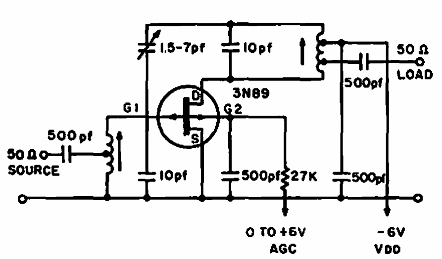 Sugerido por uma Electronic Design de 1965 este circuito tem um ganho de 15 dB em 45 MHz, podendo ser alterado para operar em outras frequências. O FET tetrodo é componente pouco comum atualmente.