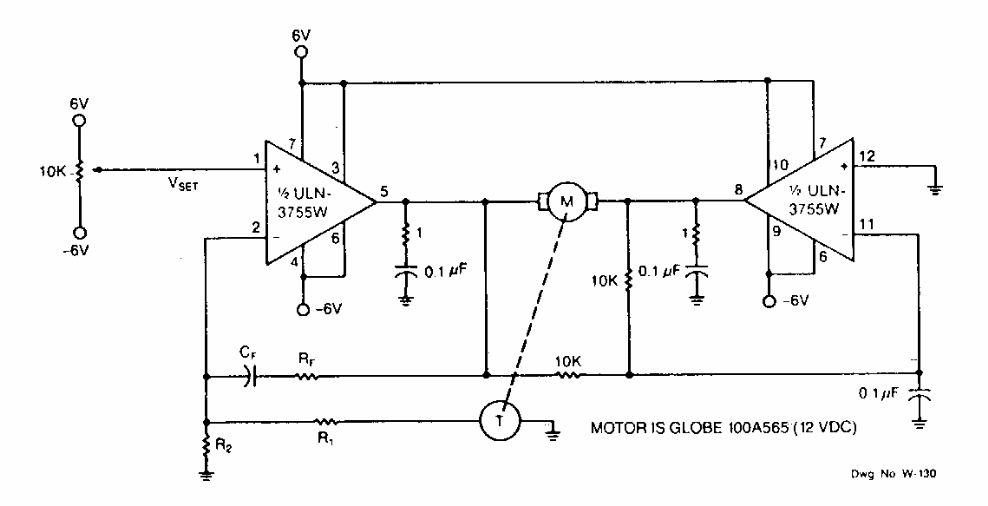 Este circuito foi sugerido pela Sprague Electric numa documentação dos anos 80. O circuito usa um sensor tacométrico para realimentação. A corrente não foi indicada na documentação original.