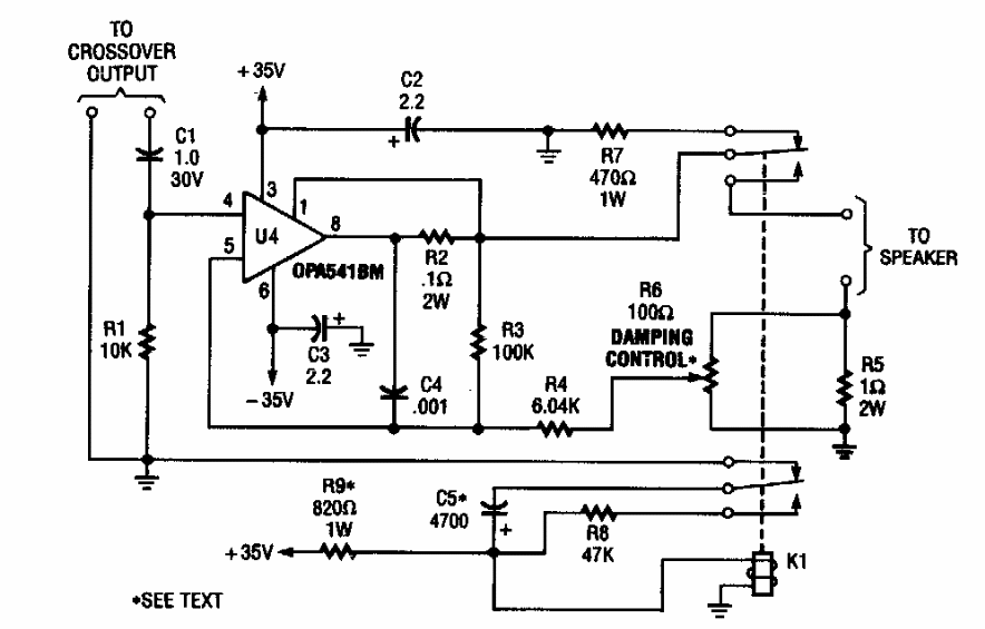 Sugerido por uma Popular Electronics antiga, este circuito se baseia um integrado pouco comum atualmente, o OPA541BM. O circuito fornece 100 W em carga de 8 ohms e exige alimentação com tensão relativamente elevada de fonte simétrica.
