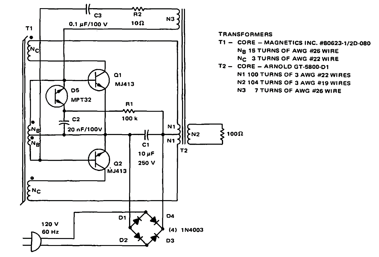 Este circuito foi encontrado num manual da Motorola de 1968. Como ele pode-se obter 20 V em 15 kHz a partir de 120 V x 60 Hz. Os componentes são da época.