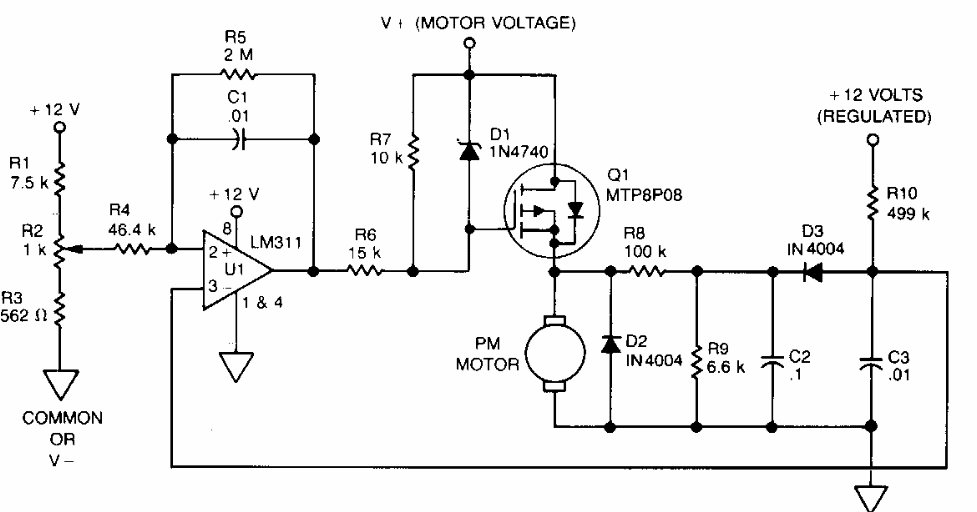 Este circuito foi encontrado em documentação da Motorola dos anos 80. O MOSFET admite equivalente de acordo com a corrente e tensão do motor que deve ser controlado.