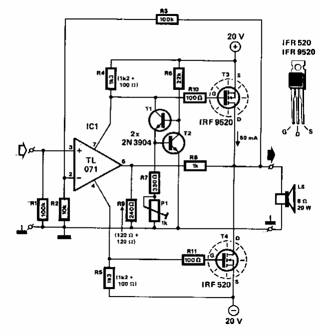 Este circuito foi obtido numa documentação americana dos anos 80 podendo ser aplicado a MOSFETS de potência equivalentes mais modernos. O circuito precisa de tensão relativamente elevado para operar.