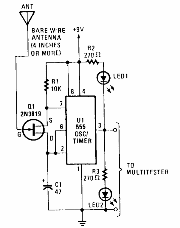 Este eletroscópio foi encontrado numa Popular Electronics dos anos 90. Qualquer FET de junção pode ser utilizado. O circuito deve ser alimentado por bateria.