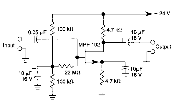 Este circuito foi obtido em documentação americana antiga sendo válido para JFETs comuns. O circuito possui uma compensação de offset para a polarização.