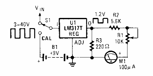 Com base num LM317T, este circuito encontrado numa Popular Electronics trabalha com sinais de frequências até 100 kHz. O circuito usa um medidor analógico de 100 uA.