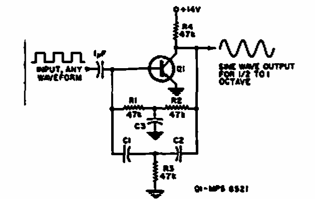 Este circuito foi obtido numa Electronics World de 1968. O transistor pode ser de uso geral e a frequência é determinada pelos componentes do duplo T. O sinal de saída é senoidal.