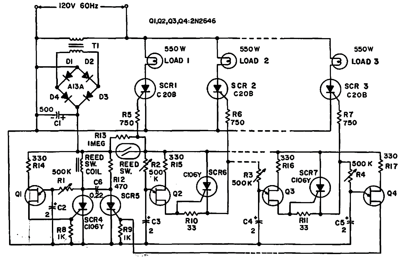 Encontrado em documentação americana antiga este circuito faz uso de semicondutores da família dos tiristores como SCRs, Triacs e unijunções. O circuito pode controlar cargas até 550 W com os triacs indicados.