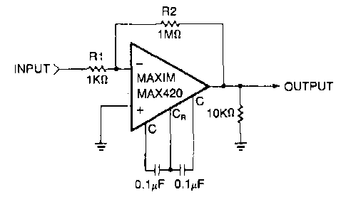 Este amplificador foi encontrado numa documentação da Maxim dos anos 90. O circuito é do tipo inversor com ganho 1 000 devendo usar fonte de alimentação simétrica.