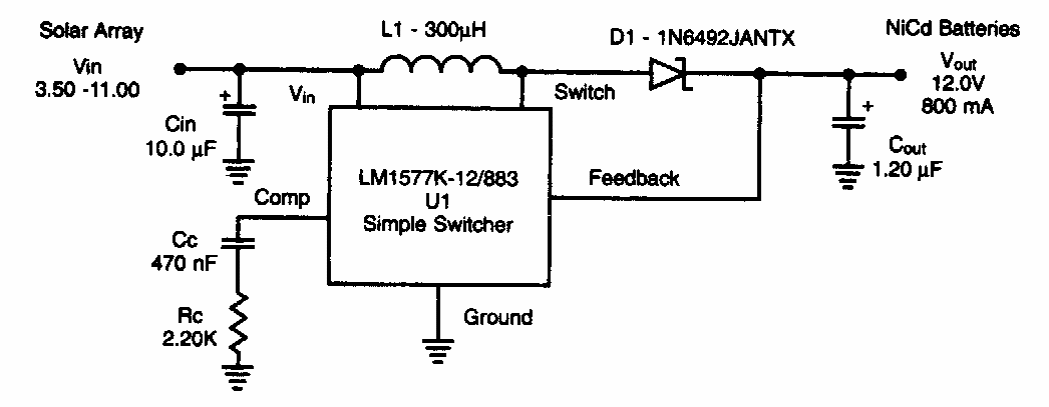 Sugerido pela National Semiconductor em documentação dos anos 90, este circuito usa um regulador chaveado da época. O circuito é indica para cargas de baterias de NiCad.
