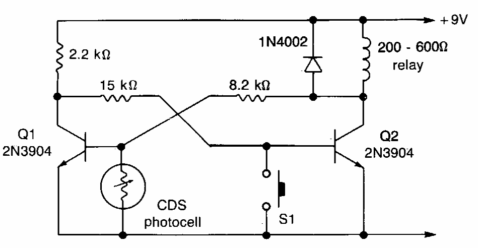 Este circuito é de uma documentação americana dos anos 80. Os transistores são de uso geral e o relé pode ser de 6 ou 12 V conforme a tensão da alimentação.
