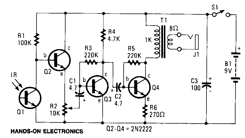 Encontrado numa documentação antiga, este circuito usa componentes ainda comuns no mercado. O transformador pode ser eliminado se for usado fone de alta impedância. O fototransistor pode ser de qualquer tipo.