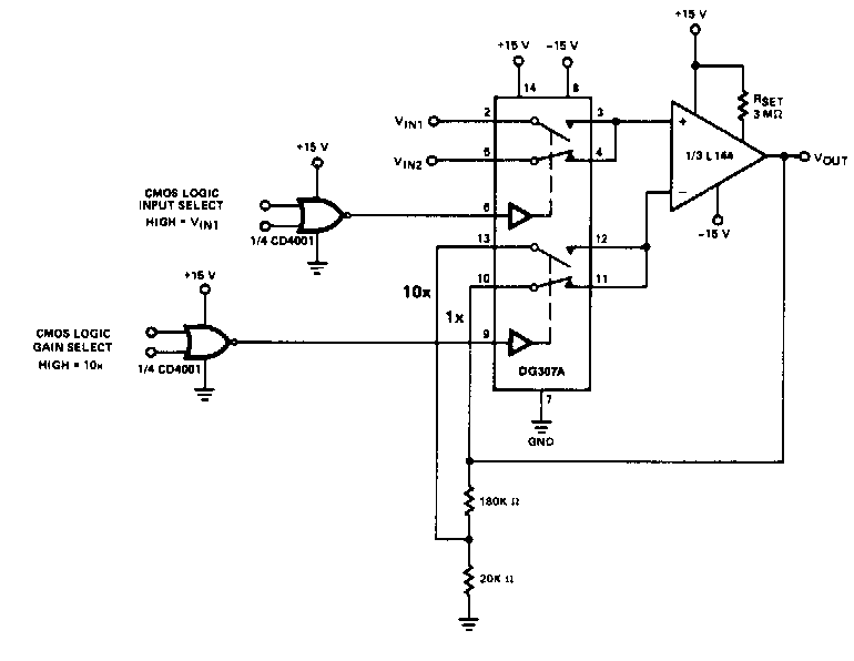 Sugerido pela Siliconix em documentação dos anos 90, este amplificador tem seu ganho selecionado digitalmente. Os componentes são da época, não fáceis de encontrar atualmente.