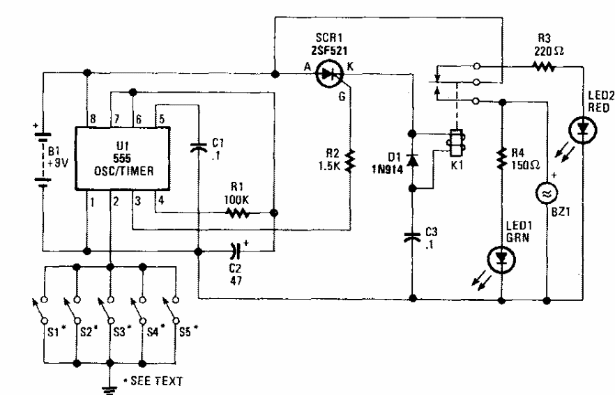 Encontrado numa antiga Popular Electronics este circuito ainda é atual. O SCR pode ser da série 106 e o relé de acordo com a tensão usada na alimentação. A tensão pode ser de 12 V.