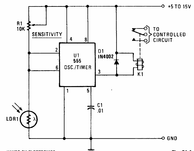 Esta configuração tradicional com o 555 foi obtida numa Hands-On Electronics dos anos 80. O relé é do tipo sensível de acordo com a tensão de alimentação.