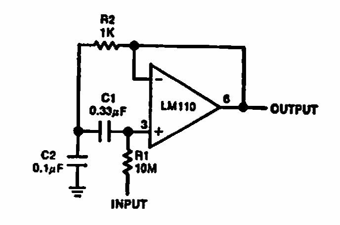 Este circuito com largura de faixa de 20 MHz foi sugerido pela National Semiconductor em documentação de 1970. Operacional equivalente moderno pode ser usado.