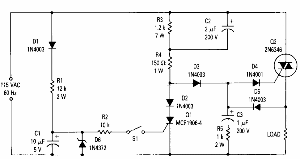 Encontrado em documentação da Motorola dos anos 90, este circuito faz uso de um triac da época. O circuito é para a rede de 110 V mas pode ser modificado para outras tensões de rede.