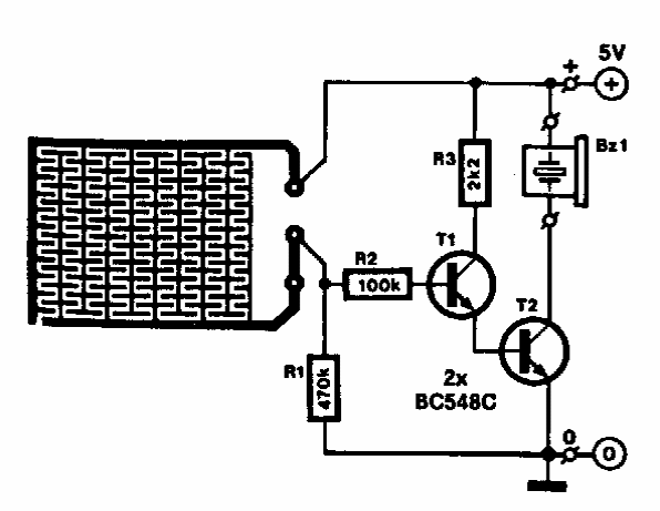 Encontrado numa Elektor dos anos 90, este circuito dispara um buzzer tipo Sonalert quando o sensor é atingido pela água. O circuito deve ser alimentado por bateria ou fonte isolada.