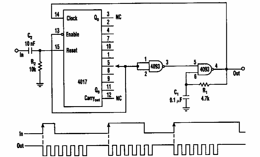 Encontramos este circuito numa Electronic Design. O circuito integrado principal é o 4017. As frequências são determinadas pelos circuitos RC assim como a duração do trem de pulsos gerado.