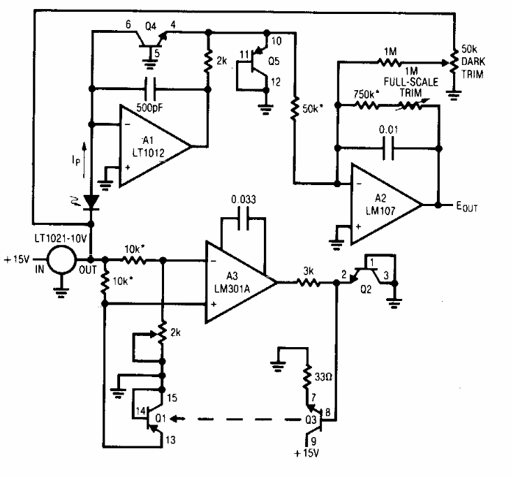 Sugerido pela Linear Technology em documentação dos anos 90, este circuito é estabilizado termicamente. O circuito é um condicionador de sinais para fotodiodos.