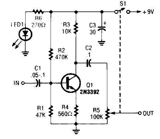 Este circuito é de uma Popular Electronics dos anos 90. Seu ganho é de 22 dB podendo ser usado como pré-amplificador. O transistor pode ser qualquer um de uso geral.