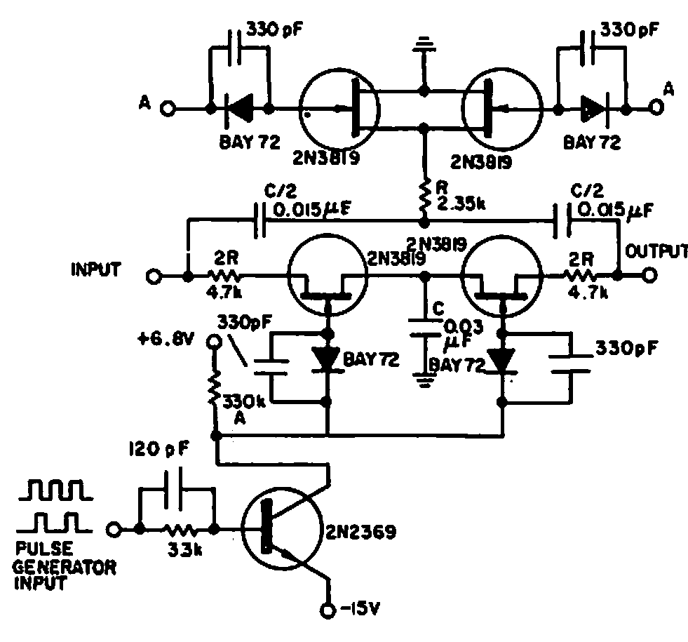 Este filtro de comutação rápida foi encontrado numa Electronic Design de 1970. O filtro pode ser ajustado entre 30 e 800 Hz a partir de pulsos de 10 a 200 kHz aplicados à entrada. Transistores equivalentes podem ser usados.