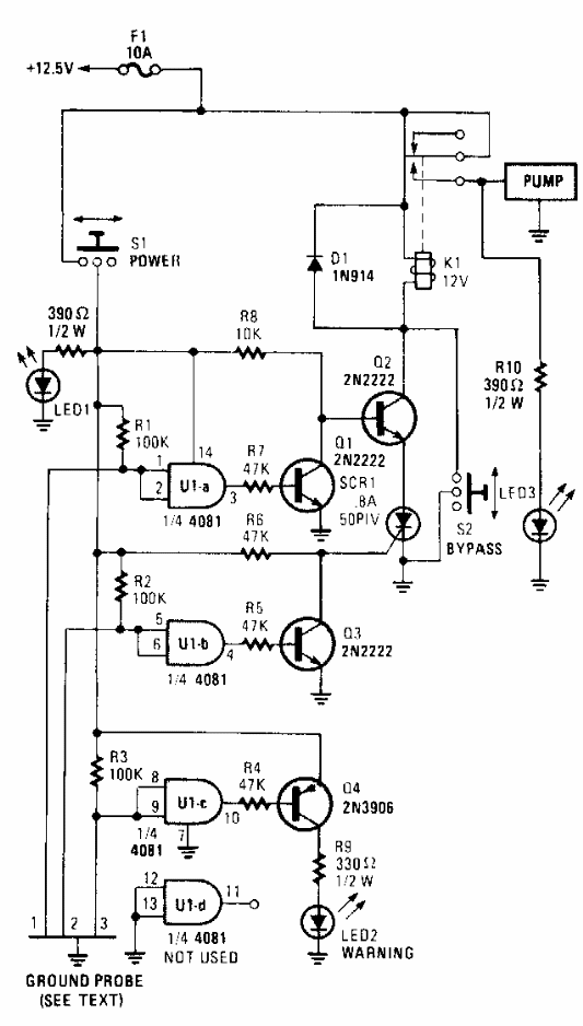 Encontrado numa Popular Electronics este circuito usa componentes atuais para controlar uma bomba de modo a manter o nível da água num reservatório. O circuito deve ser alimentado por fonte isolada da rede de energia.