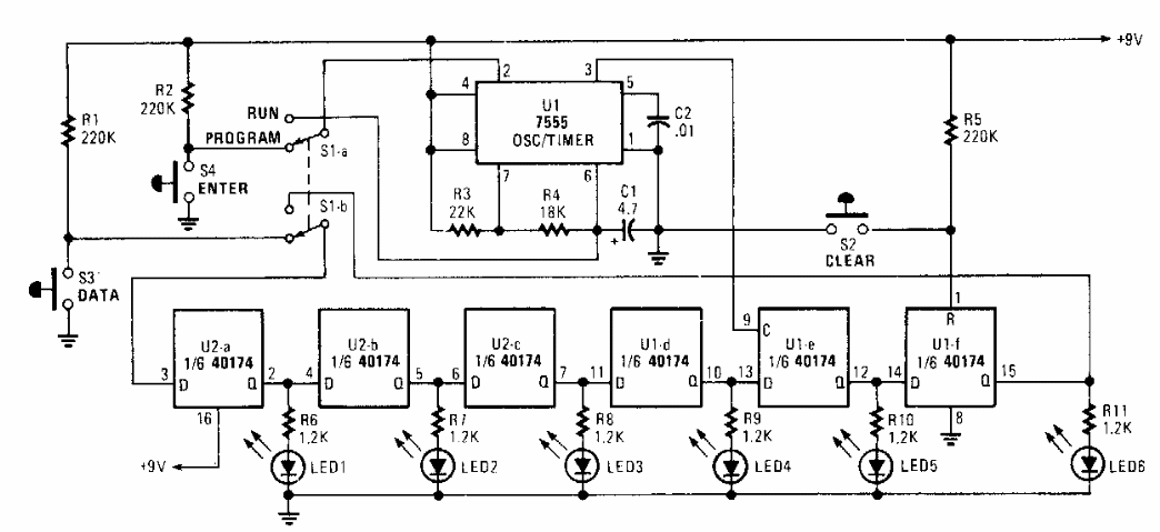 Este circuito sequencial de LEDs foi encontrado numa Popular Electronics dos anos 90. O circuito pode ser programado e uma adaptação consiste em se usar acopladores ópticos para acionar cargas de potência.