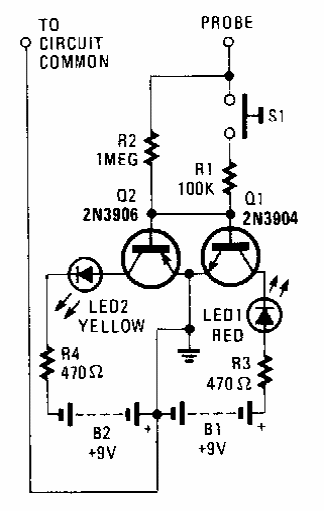 Encontrado numa Radio Electronics este simples circuito indicador usa transistores de uso geral comuns em nossos dias. Os LEDs podem ser cores diferentes.