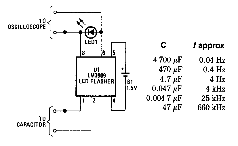 A frequência das piscadas do LED depende do valor do capacitor testado conforme a tabela. Encontramos este circuito numa Popular Electronics dos anos 80.