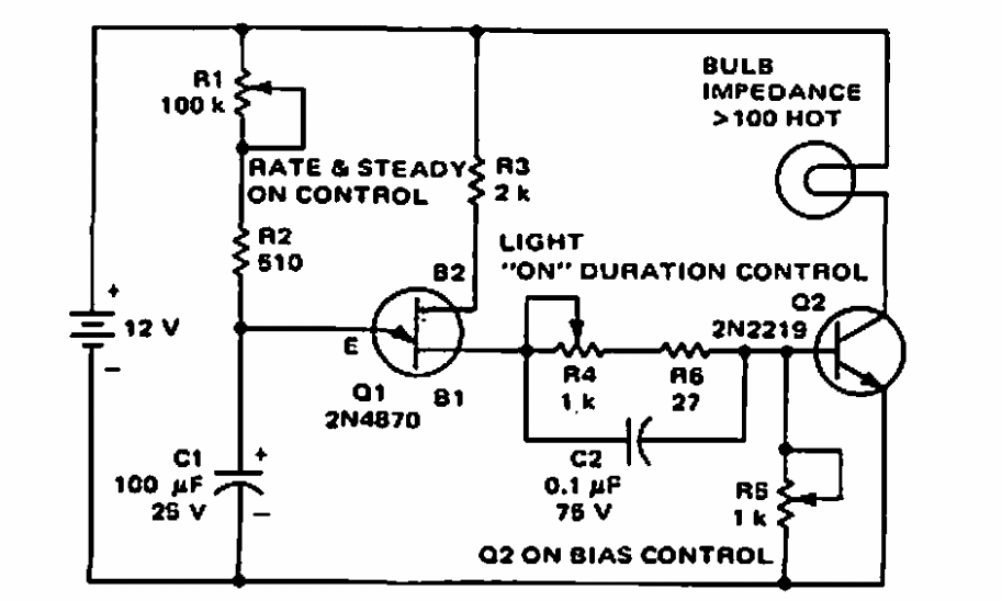 Este circuito foi obtido em documentação da Motorola. Ele gera pulsos de luz a razão de 120 por minuto. Transistores equivalentes podem ser usados. O circuito também pode excitar LEDs de alto brilho.