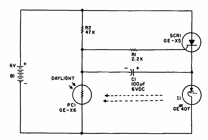 Encontramos este circuito num manual da General Electric de 1965. O circuito se aplica a lâmpadas incandescentes apenas e a operação ocorre com o corte da luz. A lâmpada pisca, pois trata-se de tipo da época que contém no seu interior um bimetal.