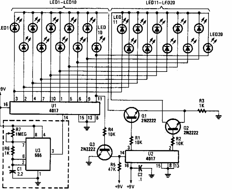 Este circuito foi obtido numa Popular Electronics antiga. Ele faz uso de componentes bastante comuns. A velocidade do efeito é ajustada em R7. O circuito aciona 20 LEDs.