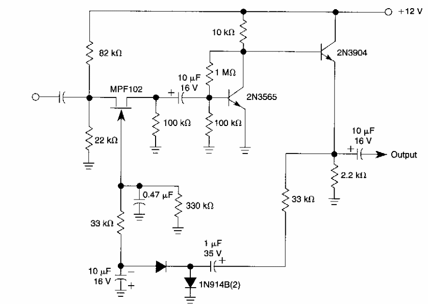 Este circuito tem uma faixa de controle dinâmico automática de ganho de 6 dB a 40 dB. Encontramos numa documentação dos anos 90. O transistor bipolar é de uso geral.