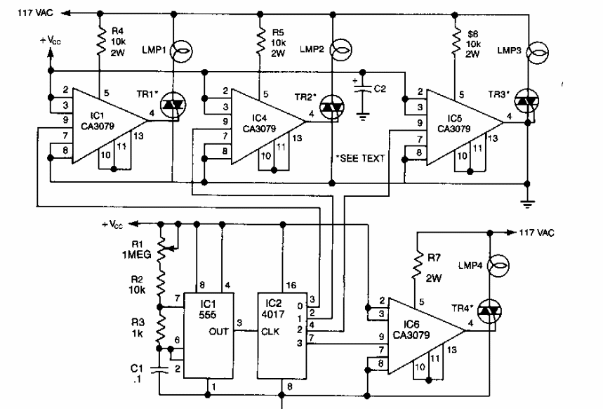Este flasher para lâmpadas incandescentes foi encontrado numa Radio Electronics dos anos 80. O circuito usa componentes da época, alguns não fáceis de obter em nossos dias. Podem ser empregados equivalentes com as devidas alterações do circuito.