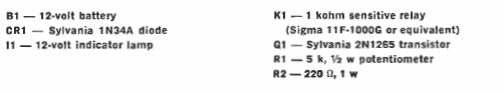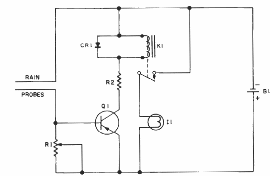 Este circuito aciona um relé quando as gotas de chuva caem no sensor. O circuito é de uma documentação da Sylvania de 1960. O relé é de acordo com a tensão da bateria.