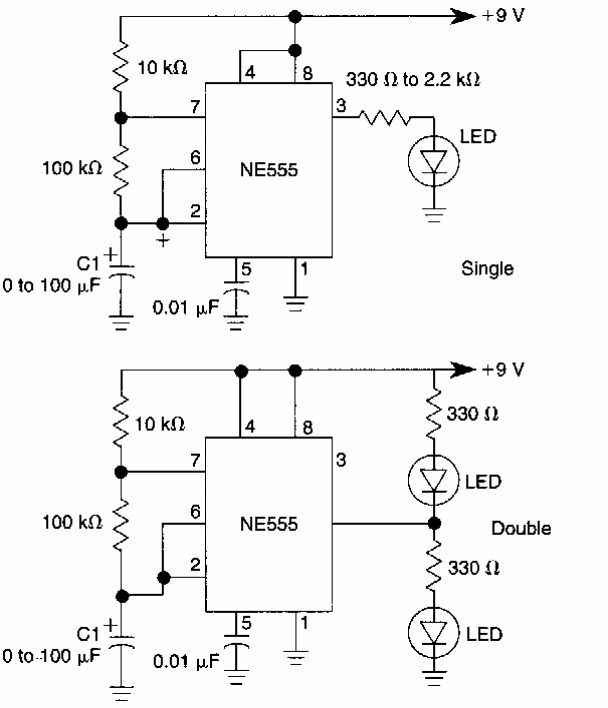 Estes dois circuitos para 1 e 2 LEDs foram encontrados em documentação americana dos anos 90. Os circuitos podem ser alimentados por tensões menores se forem usados, por exemplo, em vestíveis.