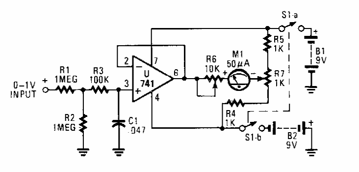 Este simples provador foi encontrado numa Popular Electronics dos anos 90. O circuito é alimentado por duas baterias de 9 V já que exige fonte simétrica.
