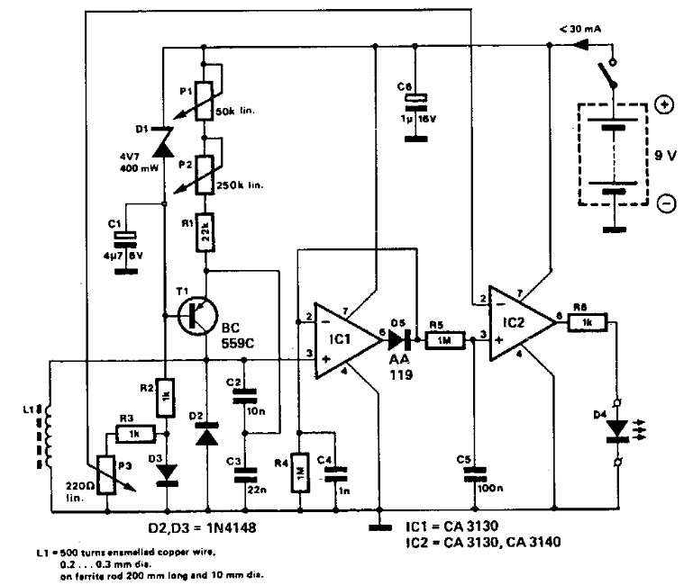 Encontrado num 303 Circuits dos anos 90, este circuito usa componentes que ainda são comuns e tem por indicador um LED comum.