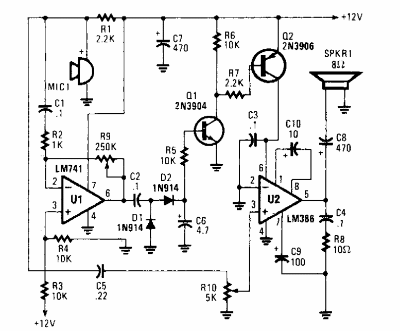 Este circuito de um canal foi encontrado numa Popular Electronics dos anos 90, funcionando como um vox. Os componentes são comuns atualmente.