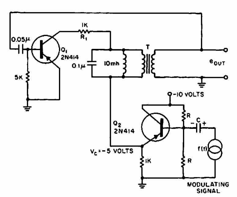 Este oscilador modulado em amplitude (AM) foi encontrado numa Electronic Design de 1965. O circuito emprega componentes da época.