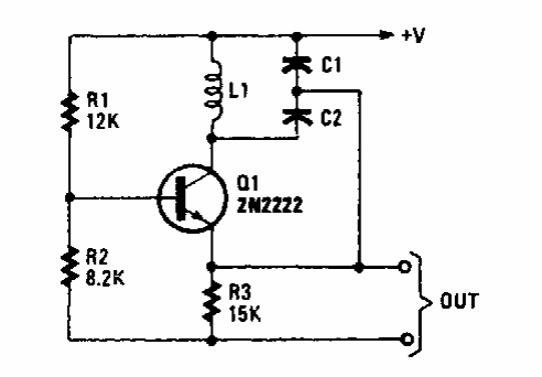 Encontrado numa Popular Electronics dos anos 90, este circuito alcança algumas dezenas de megahertz. L1, C1 e C2 determinam a frequência de operação.