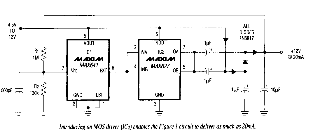 Obtivemos este circuito numa documentação da Maxim dos anos 90.O circuito tem como base o MAX627. Este circuito fornece uma tensão de saída de 12 V a partir de entrada de 4,5 a 12 V.
