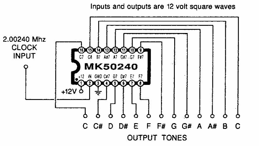 Encontrado numa Radio Electronics dos anos 90, este circuito usa um componente da época, difícil de encontrar atualmente. Ele gera 12 tons em oitavas diferentes.