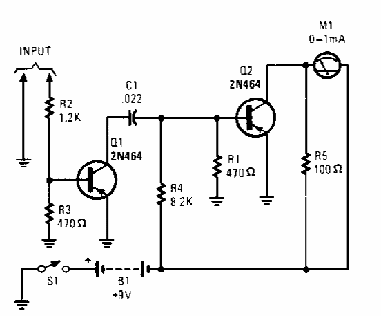 Este circuito, encontrado numa Popular Electronics dos anos 90 usa um miliamperímetro de 0 a 1 mA, que pode ser substituído pela escala mais baixa de corrente de um multímetro comum.