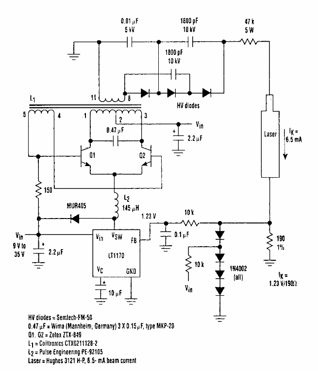 Esta fonte pata Laser a gás foi obtida numa Electronic Design dos anos 90. O circuito usa um regulador chaveado da época. Equivalentes podem ser usados.