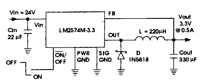 Encontrado em documentação técnica da National Semiconductor, ste circuito fornece uma tensão de 3,3 V com 500 mA na saída. O componente é da época.