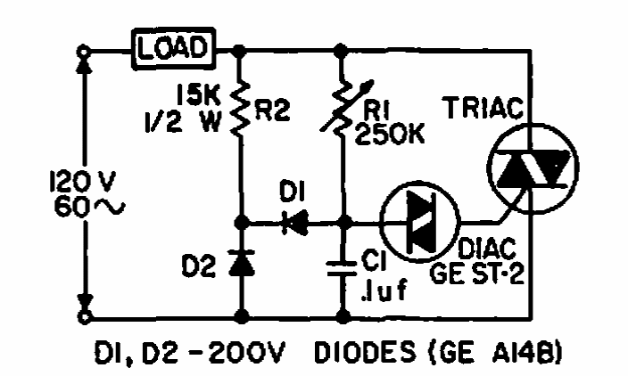 Este circuito foi encontrado numa documentação da General Electric de 1966, Ele se aplica a qualquer triac e os diodos podem ser uso geral de 200 V O triac deve ser acordo com a carga controlada.