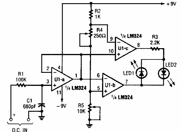 Este circuito foi obtido numa Popular Electronics dos anos 90. Os operacionais admitem equivalentes como 741 ou mesmo comparadores como o LM339.