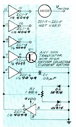 Este simples circuito PWM foi encontrado na revista Radio Electronics de março de 1991. A corrente depende do transistor usado. C1 deve ser escolhido de acordo com o motor.